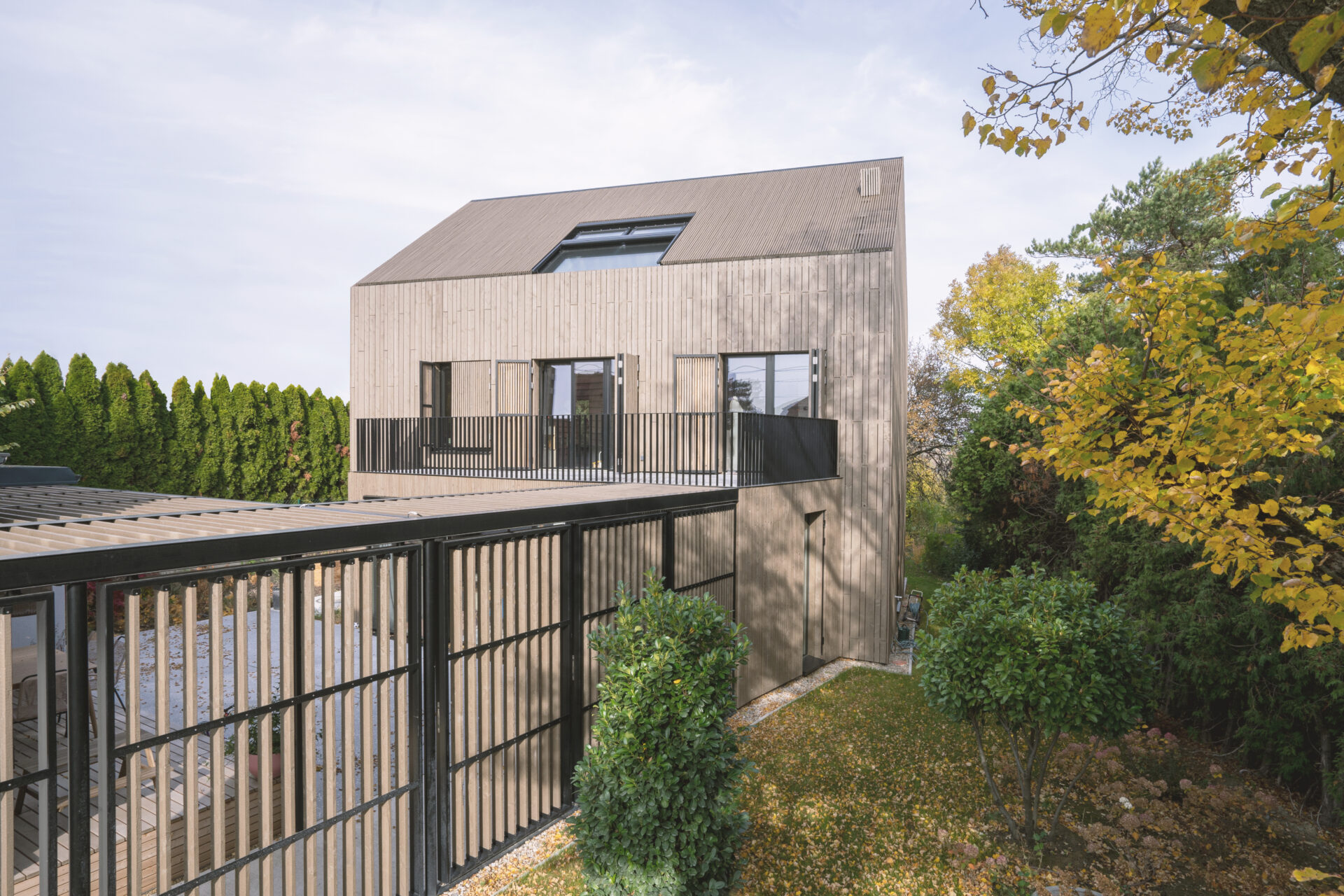 The wooden slats shield the interior from strong sunlight. On cloudy days, they are pushed to the side to let in light and air. The seating niches attached to the facade provide spontaneous places to sit and rest or enjoy the view of the Danube.