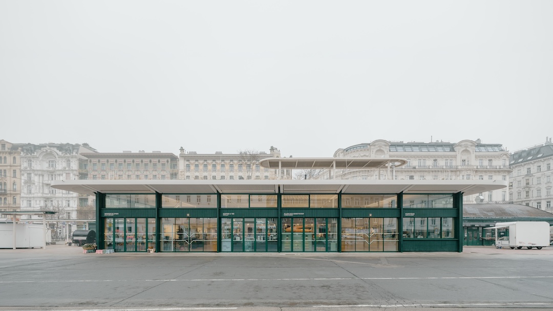 With its green-glazed façade and warm wooden surfaces, the architecture continues the familiar language of the Naschmarkt.