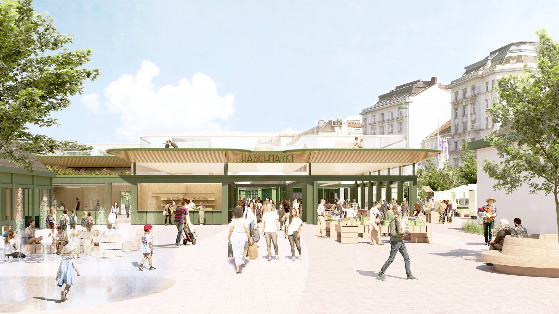 Central to our considerations is the development of a year-round market concept which, in addition to a well equipped open space, provides a weather-protected marketplace for all seasons. A large roof combined with a slender façade is central to the design. Depending on the weather, the façade can be opened and closed to make it usable all year round. With the year-round market square, the Naschmarkt now has a closure again and, in conjunction with the existing buildings on the Kettenbrückengasse side, forms a spatial forecourt as an entrance to the market area.
