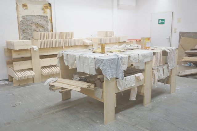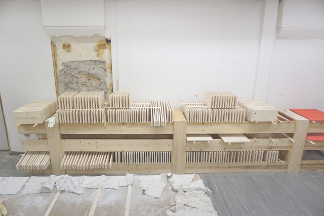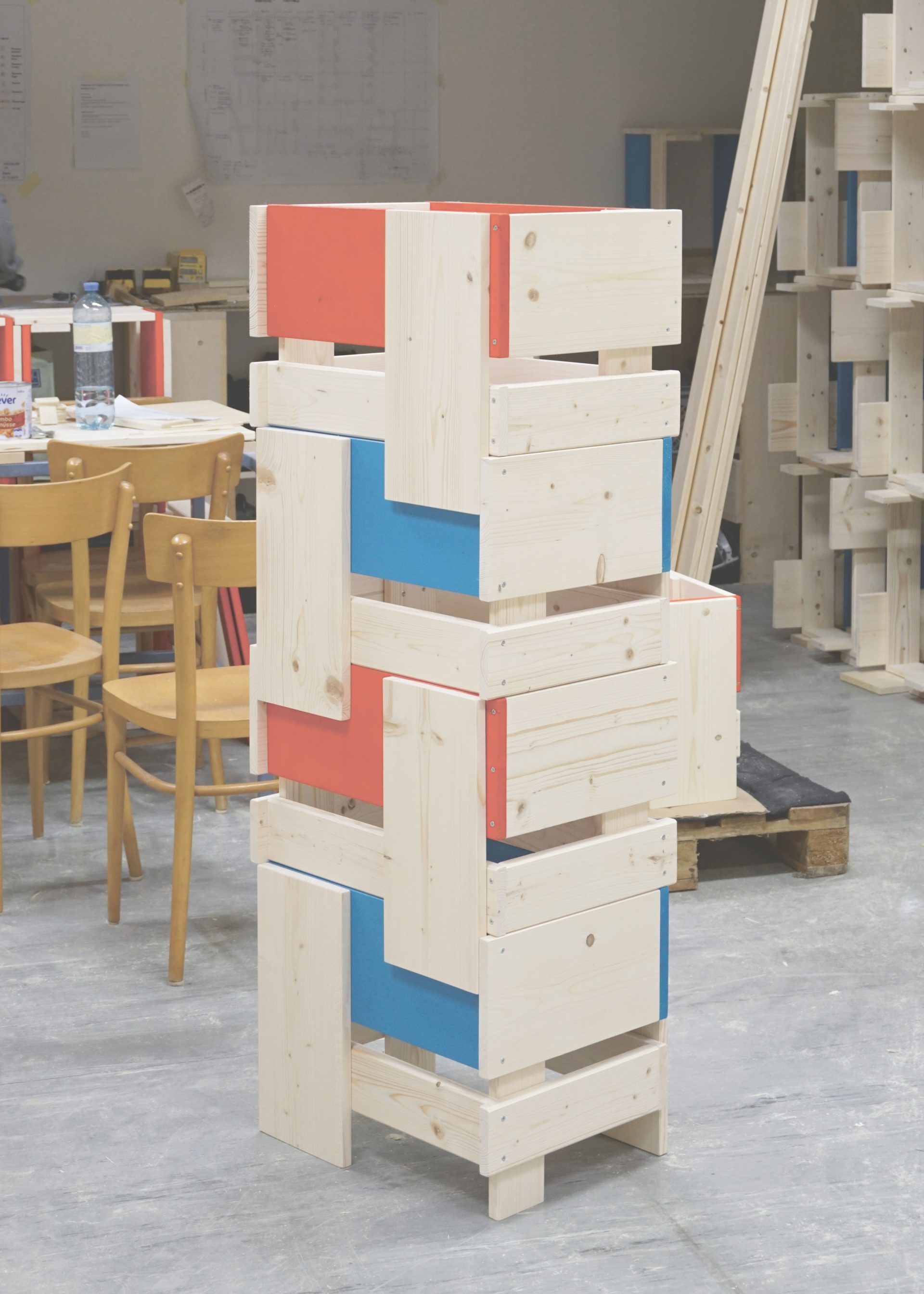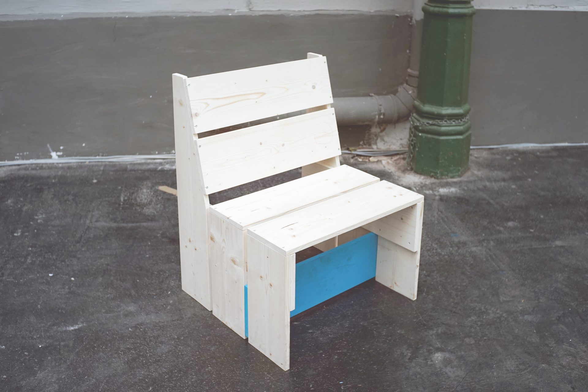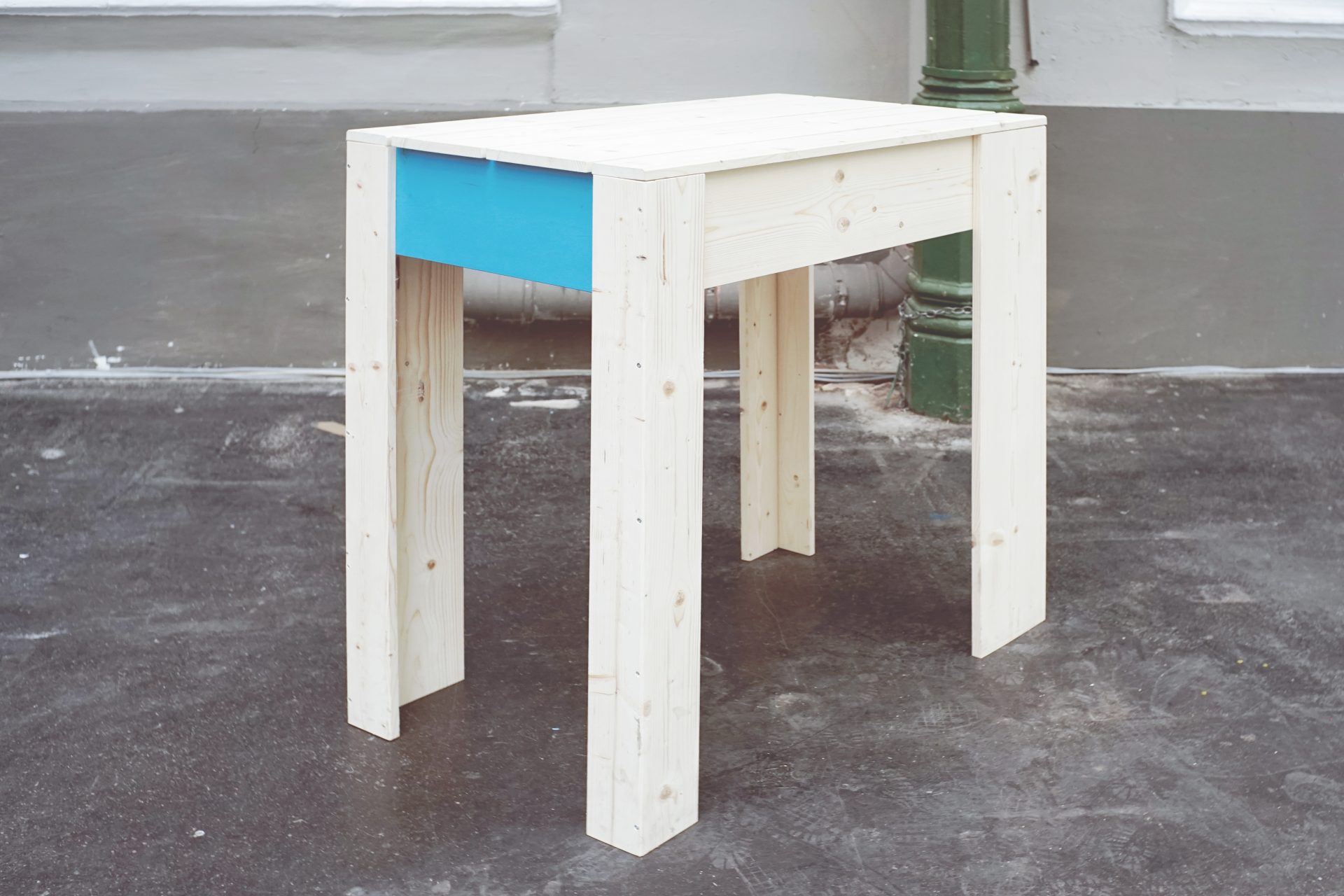 The Markterei furniture series was developed in collaboration with MO-NI-KA and produced in a small batch for the neighborhood market “Markterei.” All pieces are designed for quick and efficient construction, as we had to manufacture a large quantity in a short time within a temporary workshop set up in the Alte Post. In line with our vision of multifunctional market furniture, the bench, market table, and modular unit can be flexibly combined, stacked, and interlocked to create spatial arrangements. The series is complemented by a standing table and stools.