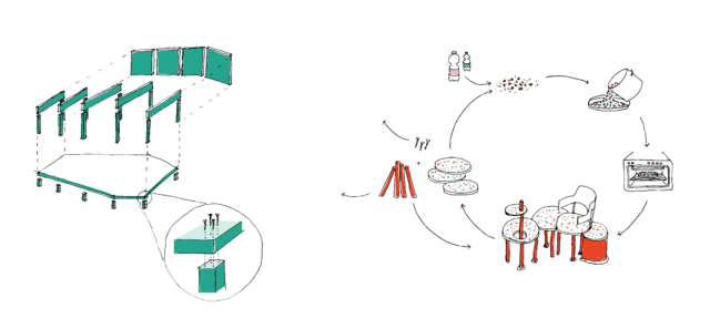 We have already implemented our Circular Architecture Guideline in two projects. The Plauderecken demonstrate how urban furniture can be rethought using recycled materials — their colourful seating surfaces are made from reused shampoo caps. For the Cultural Pavilion for Kultursommer.Semmering, we developed a fully demountable concert hall whose untreated wooden surfaces can return to the material cycle.