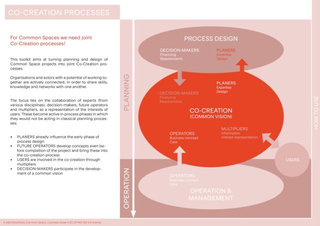 The Co-Creation Toolkit offers practical methods and instruments for shared spatial practice. It helps to structure participatory design processes, clarify roles, and support long-term cooperation. The toolkit acts as a resource for planners, communities, and institutions working on the collective use and management of space. If you want to download the full Co-Creation Toolkit klick here